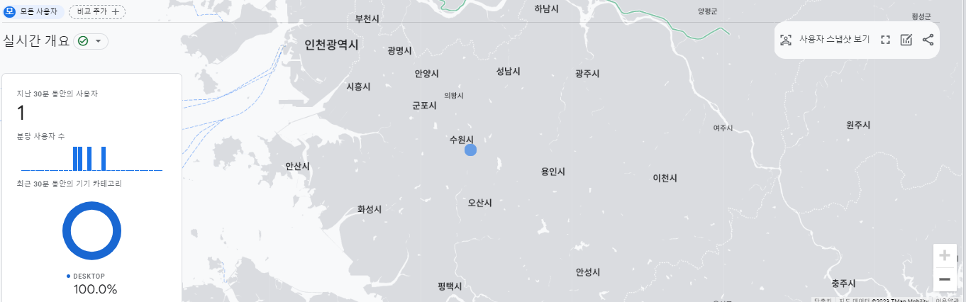 개요 화면에서 위에 보이는 지도를 보면 실시간 사용자가 어느 위치에서 접속했는지 알 수 있습니다.