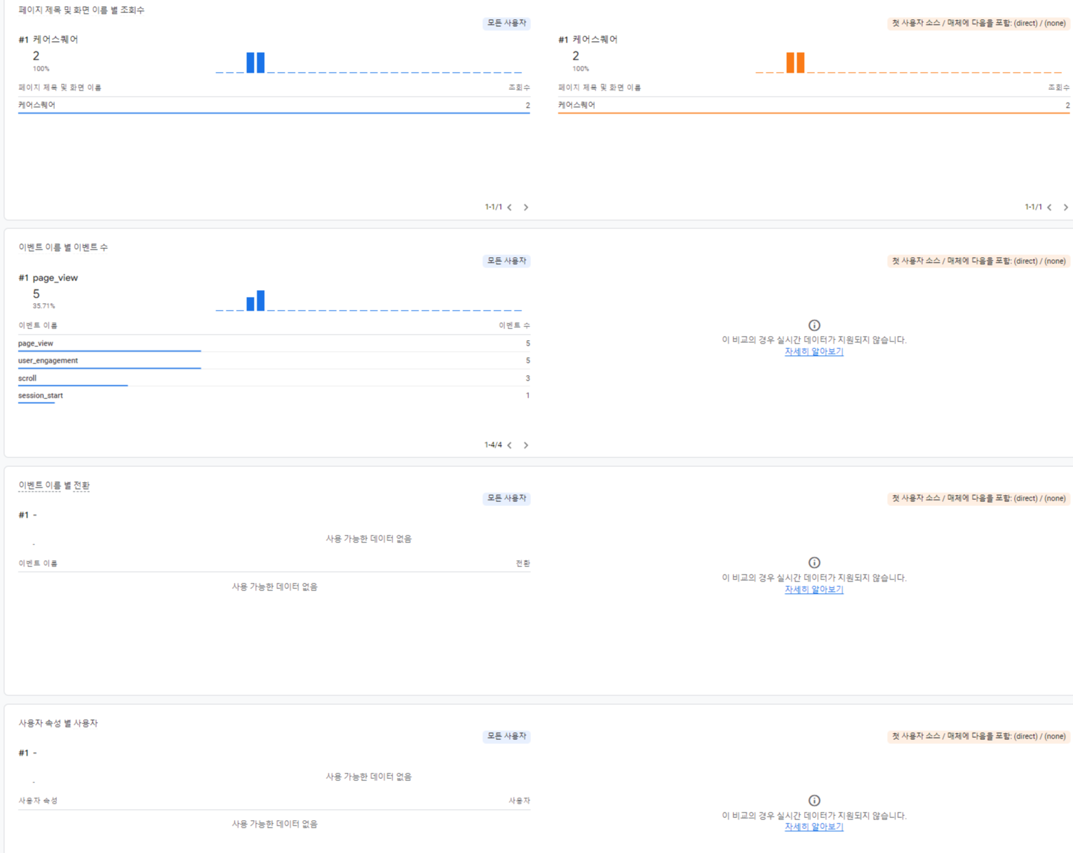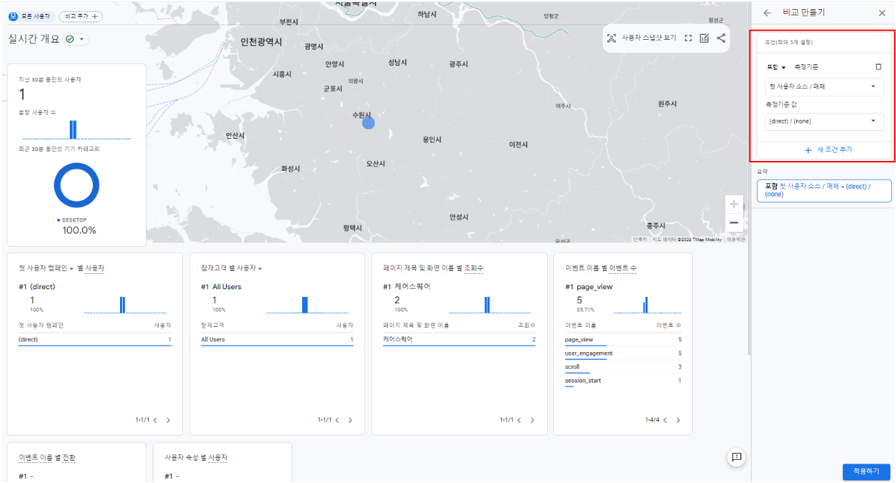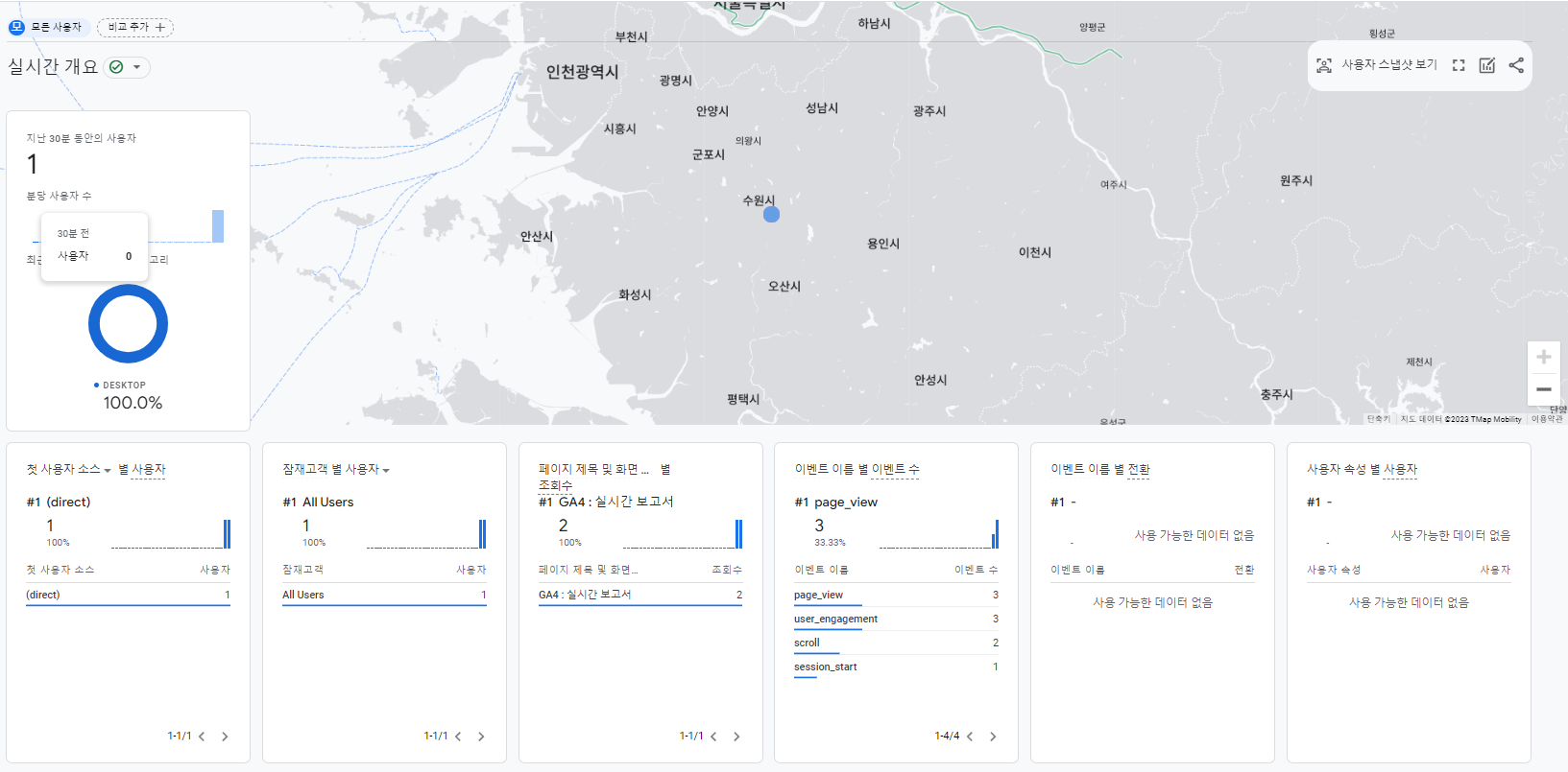 예를 들어. 구매완료 라는 이벤트를 설정했다면 해당 보고서에서 구매완료 이벤트가 발생한 사용자 수를 실시간으로 확인할 수 있습니다.