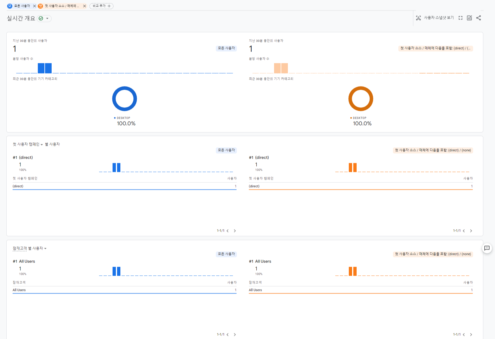 첫 사용자 소스/매체 : 첫 사용자 소스와 첫 사용자 매체를 동시에 보여줍니다.