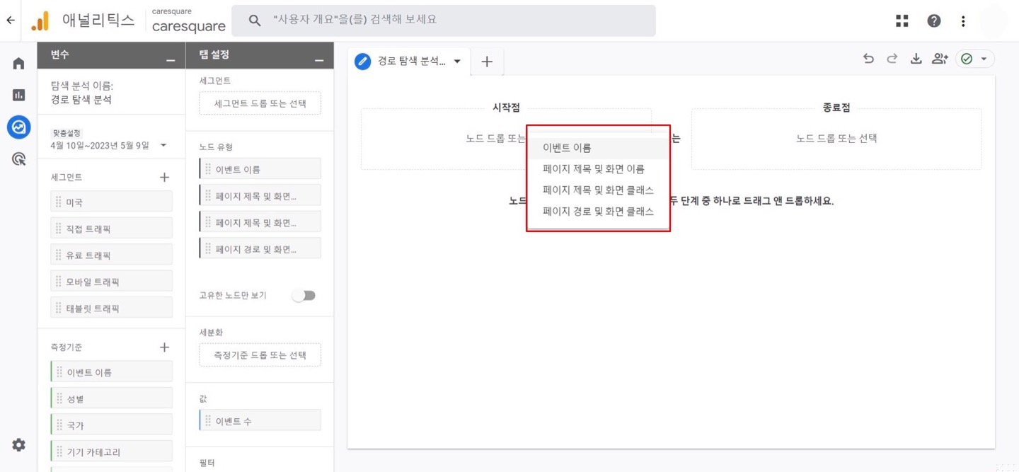 2. 이벤트 이름, 페이지 제목, 페이지 경로, 화면 이름 또는 화면 클래스를 시작 노드로 선택합니다.