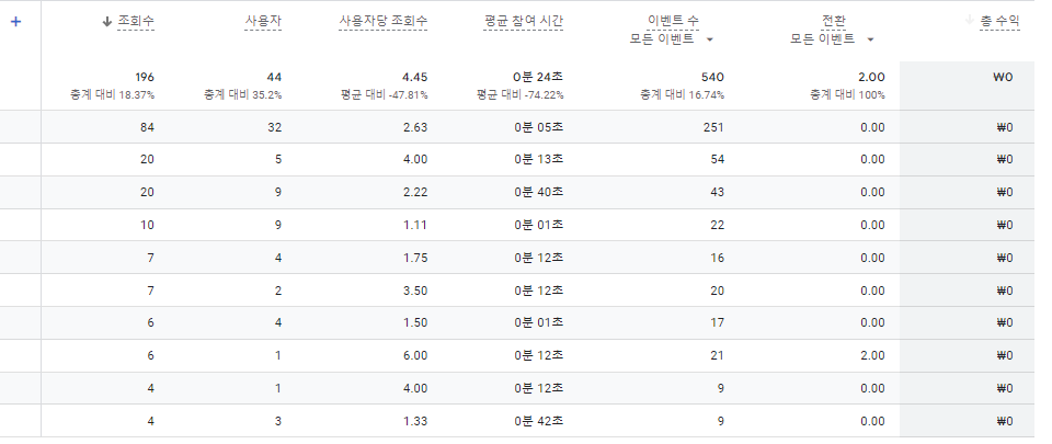측정 항목은 동일합니다. 세션 수, 사용자, 새 사용자 수, 세션당 평균 참여 시간, 전환 ,총 수익으로 이루어져있고 추가 및 수정도 가능합니다.
