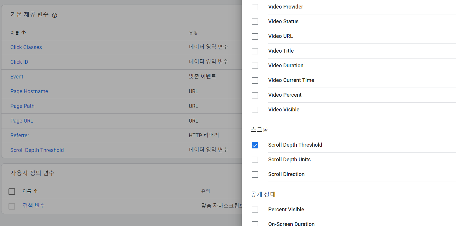 근데!! 태그를 설정하기 전에 아마 많은 분들이 기본제공변수에 Scroll DepthThreshold가 선택이 안되어 있을거에요!