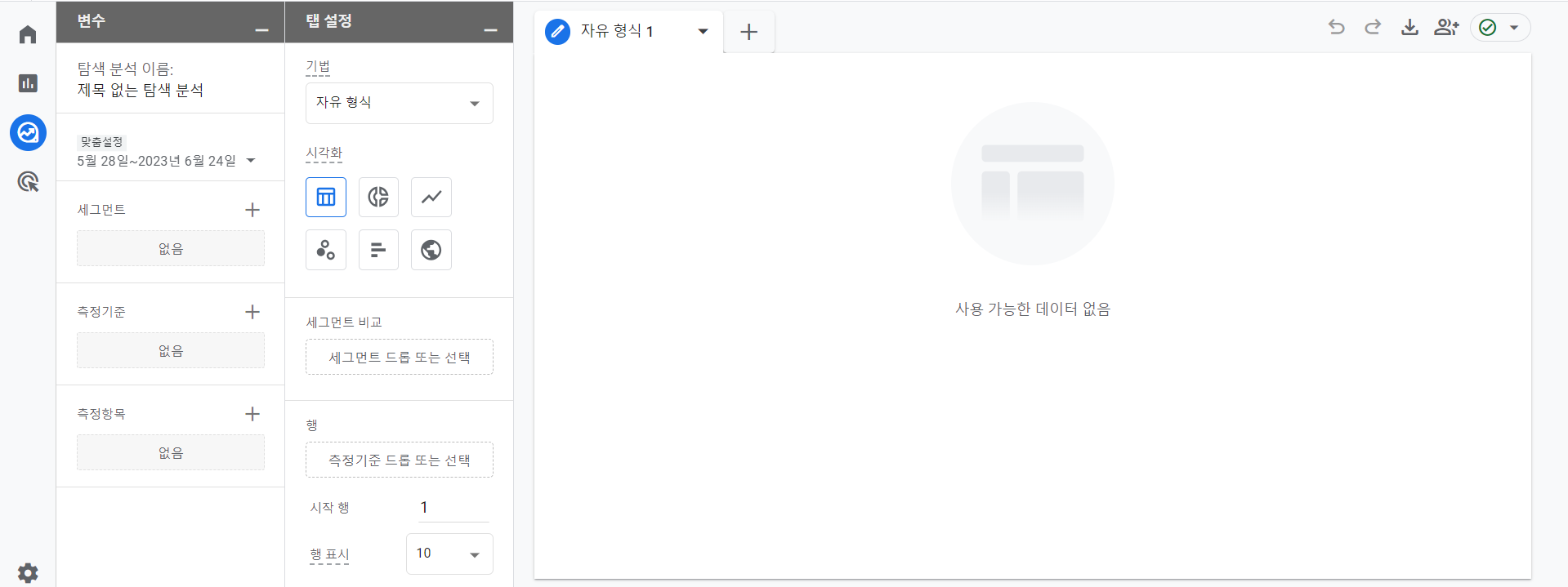 처음 탐색 보고서 만들기에 어려움을 느끼시는 분들은 예시 변수들이 주어지는 자유 형식 보고서에 들어가 여러 설정을 바꾸고 적용해보며 익숙해지는 것을 추천드립니다.