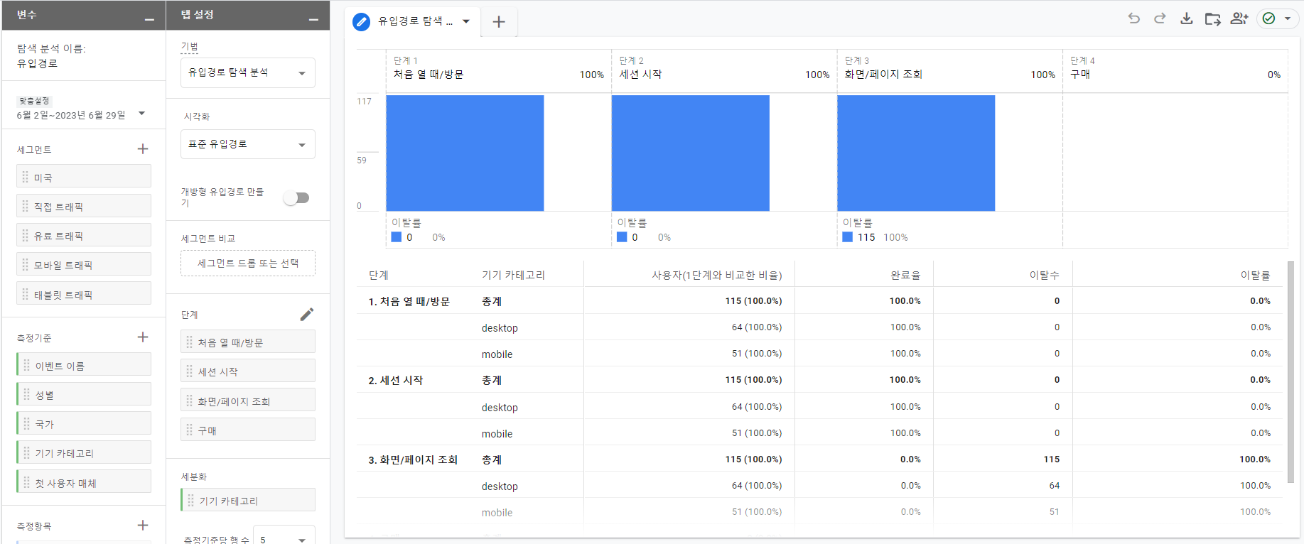 위와 같이 유입 경로 탐색 보고서를 통해서는 각 단계를 설정하고 사용자가 원하는 행위를 하는 비율을 확인할 수 있습니다.