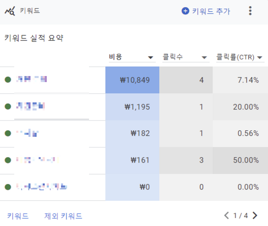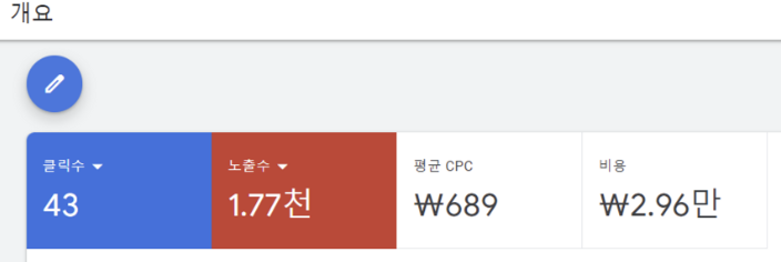 위는 키워드 광고의 실적입니다. 클릭수 총합이 9였습니다.